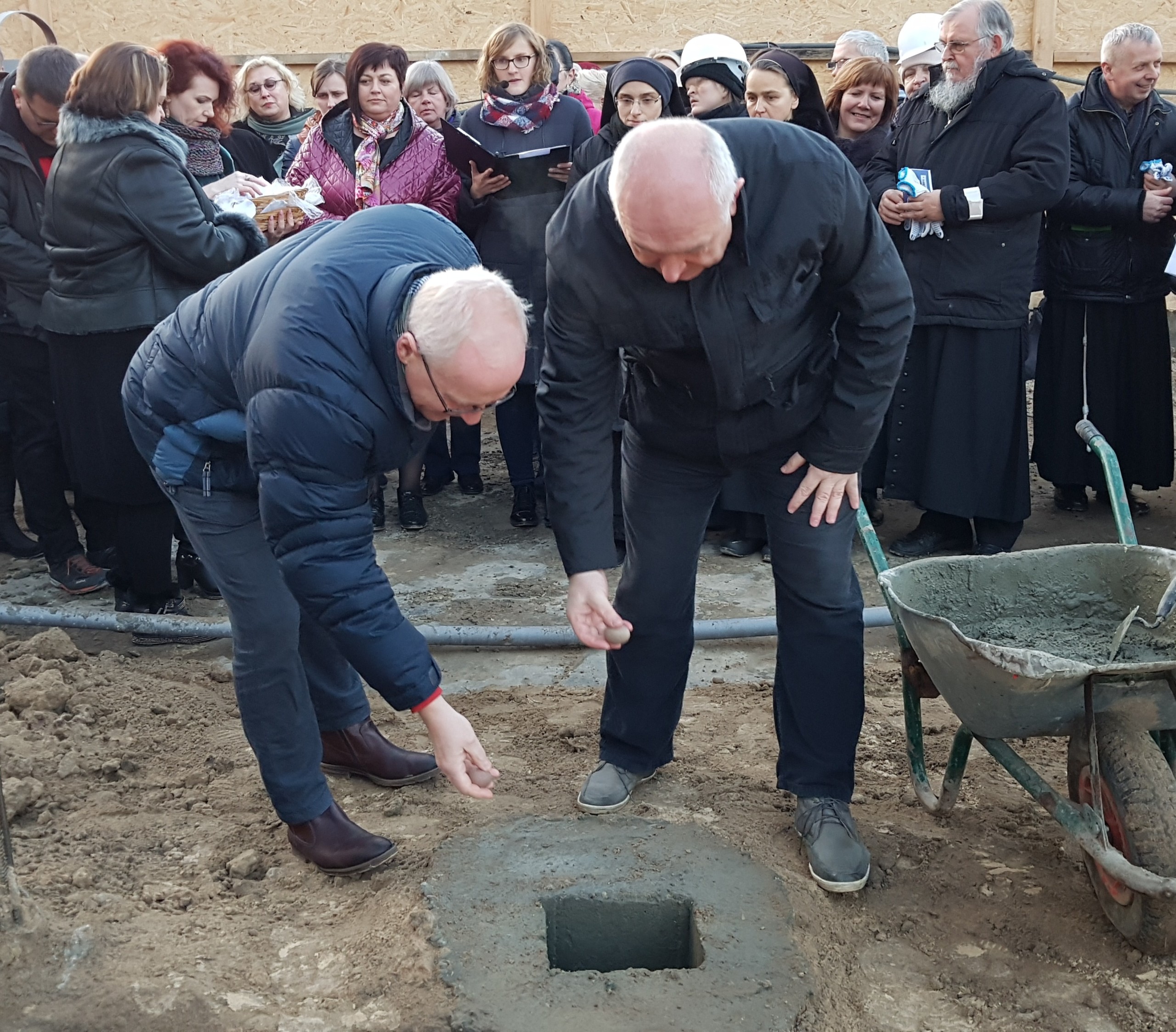 Siostra Michaela Rak, kapłani, rodziny naszych chorych, darczyńcy, pracownicy i wolontariusze we wspólnej modlitwie, unosząc wzrok do Pana, powierzyli Mu kamień węgielny pod Dział Hospicjum Dziecięcego. Kamień węgielny składał się z wielu kamyków, które są z różnych wyjątkowych miejsc świata: